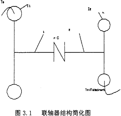 為了便于求解運(yùn)動(dòng)微分方程,需要對傳動(dòng)軸系中聯(lián)軸器的主動(dòng)和從動(dòng)兩側(cè)的轉(zhuǎn)動(dòng)慣量和剛度作力學(xué)模型的簡化。根據(jù)具體結(jié)構(gòu)情況,可以將軸系簡化為若干個(gè)等效轉(zhuǎn)動(dòng)慣量圓盤,以具有某一剛度的周聯(lián)系起來。通常比較典型的是簡化為兩個(gè)等效的圓盤,配置在聯(lián)軸器的兩側(cè)。并設(shè)定所聯(lián)兩軸的剛性很大,只有聯(lián)軸器具有彈性和阻尼。如圖3.1所示