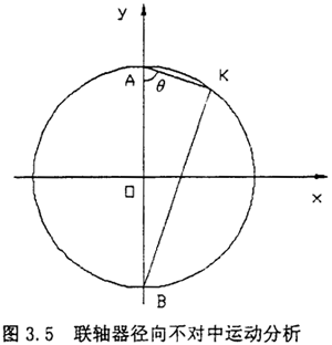 (2)當(dāng)轉(zhuǎn)子軸線之間存在徑向位移時(如圖3.3所示),聯(lián)軸器的中間套齒與半聯(lián)軸器組成移動副,不能相對轉(zhuǎn)動,但是中間套齒與半聯(lián)軸器產(chǎn)生相對滑動而作平面圓周運動,即中間套齒的中心是沿著以徑向位移△y為直徑作圓周運動,如圖3.4所示。