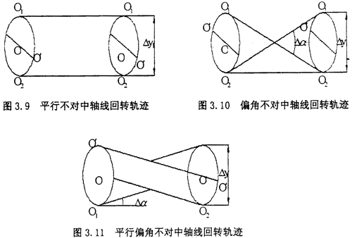 聯(lián)軸器連接的兩轉(zhuǎn)子軸線之間發(fā)生不對中故障時具有平行位移或角度位移,在運動傳遞過程中,聯(lián)軸器中間齒套的運動必須同時滿足兩半聯(lián)軸器的需要,即中間齒套軸線作平面運動,且軸心線的回轉(zhuǎn)運動頻率與轉(zhuǎn)子的運行頻率不一致。當(dāng)產(chǎn)生平行不對中、偏角不對中和平行偏角不對中三種情況時,聯(lián)軸器中間齒套的軸線回轉(zhuǎn)軌跡分別為圖下圖所示的圓柱體、雙錐體和半雙錐體。在這些圖中,O1,O2為兩半聯(lián)軸器的軸心,O,O′為聯(lián)軸器中間套齒的靜態(tài)和動態(tài)回轉(zhuǎn)中心,△y,△α分別為轉(zhuǎn)子系統(tǒng)的平行和偏角不對中量。