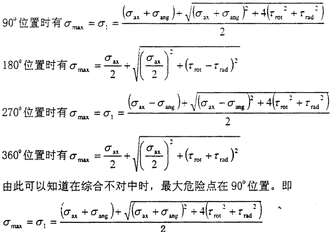2.在徑向不對中時,在給定的徑向不中量情況下,最大主應(yīng)力為發(fā)生在聯(lián)軸器360°位置,有σmax=+(τrot+τrad)。最大主應(yīng)力平面方向與y軸成45°夾角。即360°位置為徑向不對中時的危險點。