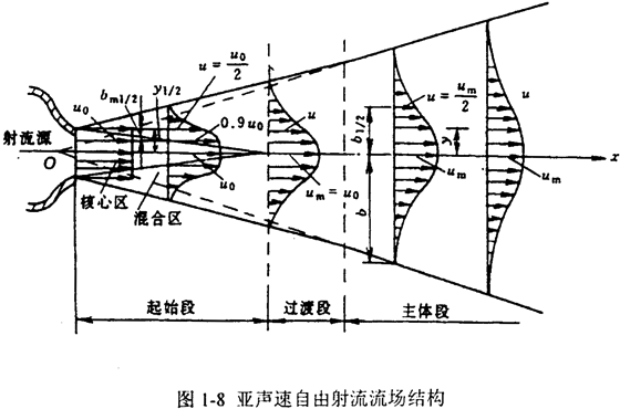 亞聲速自由射流在形成穩(wěn)定的流動(dòng)形態(tài)后,整個(gè)射流可劃分為幾個(gè)區(qū)段:由噴口邊界起向內(nèi)外擴(kuò)展的紊動(dòng)摻混部分為紊動(dòng)剪切層混合區(qū);中心部分未受摻混影響,保持原來(lái)出口流速,稱為核心區(qū),出口至核心區(qū)末端的一段稱為射流的起始段。紊動(dòng)充分發(fā)展以后的部分稱為射流的主體段。主體段與起始段之間的區(qū)域稱為過(guò)渡段。
