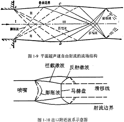 對(duì)于圖1-9所示的欠膨脹超聲速自由射流,當(dāng)射擊流從出口射入靜止大氣中的時(shí)候,由于出口截面上的射流的靜壓p1大于環(huán)境壓力pa,在裂尖的邊緣將發(fā)出兩族膨脹波,這兩族膨脹波在中心流線相交,氣體經(jīng)過(guò)膨脹波使靜壓由p1降到pa,經(jīng)膨脹波后氣流,其自由邊界向外擴(kuò)張。兩族膨脹波相交之后互相穿過(guò),并保持為膨脹波。這些膨脹波在自由邊界反射回來(lái)形成兩族壓縮波,并使氣流邊界向內(nèi)收縮。這兩族壓縮波相互穿過(guò)并在自由邊界上反射回膨脹波,這種波的相交與反射現(xiàn)象不斷地進(jìn)行下去,逐漸衰減。