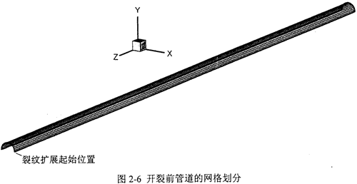 管道上的裂紋一般從起裂點同時向兩側擴展。因管道幾何形狀和載荷分布具有對稱性,本文取一側管道的一半來分析和計算,即四分之一模型,如圖2-6所示。采用四節(jié)點板殼單元,沿管道軸向和環(huán)向分別劃分網格,在管道內壁給出氣體壓力分布。