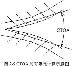 圖2-9表示了CTOA的計算方法。由于在裂紋后方有很大的非線性變形,計算中張開位移用割線近似,采用8個單元的長度來計算CTOA。這一長度經過與細化后的網格結果比較,誤差在10%之內。