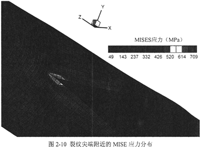 首先觀察裂尖附近的MISES應力分布,如圖2-10。按以針狀鐵素體和塊狀鐵素體組織為主的X70鋼級管線鋼的平均屈服強度500~600MPa估算,計算給出的裂尖前部塑性區(qū)長度大約在3個單元長度以內,即0.15m左右。