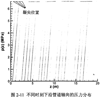 圖2-11直觀地給出了內壓10MPa,裂紋速度216m/s時一維管道氣體壓力模型(L=1.5D)下的管壁壓力沿軸向的分布。每條曲線的衰減起始點即為該時刻的裂尖位置。圖中裂尖壓力約為6.6MPa。