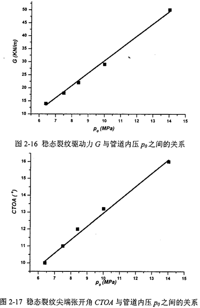 在裂紋穩(wěn)態(tài)擴展的條件下,動態(tài)能量釋放率G或裂紋尖端張開角CTOA同管道內壓p0或徑厚比SDR之間均呈線性關系。由此關系可便捷地推算任意設計參數(shù)下的裂紋驅動力。通過和第四章介紹的小試件實驗的動態(tài)斷裂韌性結果相對照,可以得到裂紋止裂或擴展的結論。