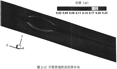 圖2-13分別按照三個方向上的位移分布在開裂前管道表面畫出云紋圖。從圖中可以看到,此種設計參數(shù)下的位移量主要發(fā)生在裂尖附近5m左右的區(qū)域,對遠端的影響較小。