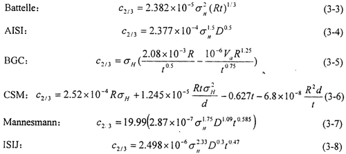 在雙曲線法的基礎上,結合大量的實驗結果對止裂韌性進行標定,世界各大研究機構分別給出了簡便易算的經(jīng)驗公式用以估算臨界止裂韌性,列舉如下: