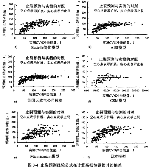 圖3-4表示了Battelle應用Maxey雙曲線法對全尺寸實驗數(shù)據(jù)庫所做的DDF止裂韌性預測,圖3-4a至圖3-4f分別對應于式(3-3)至式(3-8)。圖中顯示的實驗用管的鋼級包括X52到Xl00,管徑范圍從4O6mm到1422mm,實驗最高壓力超過16MPa?梢,預測模型在管材韌性低于某一水平時預測結果與實物實驗結果基本吻合,但當管材韌性較高時出現(xiàn)明顯偏差,預測應該止裂的管線沒有止裂。經(jīng)典的止裂預測模型在預測夏比能量值高于94J的管材時,已經(jīng)偏于危險,即過高估計了管材的止裂性能。