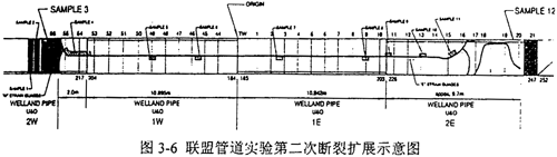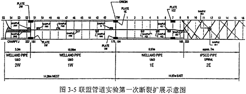 實驗二的斷口均為剪切斷裂,裂紋擴展長度為33.6m。由于1W和1E沖擊功低于預(yù)測的止裂沖擊韌性,因而裂紋均沿1W和lE軸向直線擴展并分別進入2W和2E樣管,最后在2W和2E樣管中止裂,如圖3-6所示。