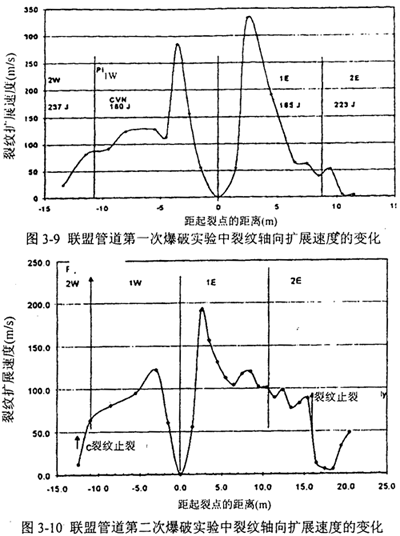 在圖3-8的所有實驗中,裂紋以全延性方式向?qū)嶒灩軆啥顺瘦S向擴展,并突然轉(zhuǎn)向周向,隨即止裂。這表明管道本身的韌性導(dǎo)致止裂。