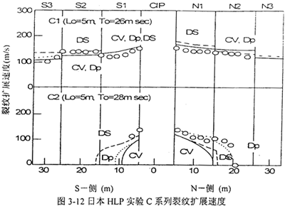 圖3-11、圖3-12表示日本HLP實驗中裂紋擴(kuò)展速率隨擴(kuò)展距離的變化,空心點為實測值。通過對易發(fā)生斷口分離(斷口分離現(xiàn)象將在下一章中介紹)的控軋(CR)鋼和調(diào)質(zhì)(QT)鋼兩種材料的臨界止裂韌性的測試,沒有發(fā)現(xiàn)大的差異,說明斷口分離現(xiàn)象對動態(tài)延性斷裂的止裂能力影響不大。