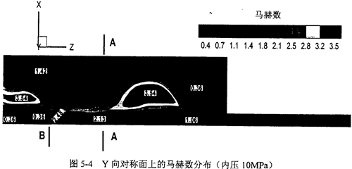 圖5-4給出了XZ對(duì)稱面上的馬赫數(shù)分布。管道中的流動(dòng)在裂尖出口處達(dá)到超聲速,而在對(duì)稱面附近發(fā)生了強(qiáng)烈的回流。標(biāo)示為B的位置壓力和密度發(fā)生了強(qiáng)間斷,意味著出現(xiàn)了激波。