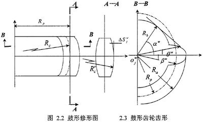 為了避免因?yàn)辇X輪聯(lián)軸器結(jié)構(gòu)誤差或內(nèi)外齒輪不對中誤差而引起齒端面和齒頂發(fā)生強(qiáng)烈火的接觸,一般對齒輪聯(lián)軸器的外齒進(jìn)行鼓形修型,此外齒輪稱為鼓形齒輪,一般鼓形齒是通過滾齒機(jī)經(jīng)過圓弧送切形成的。如圖2.2所示在分度圓切面內(nèi)A-A向齒開為弧線,在垂直于軸線截面內(nèi)其齒形近似為漸開線,齒寬中央是正常齒厚,而離形齒寬中央使外齒輪負(fù)方向變位逐漸增加,齒厚減速薄齒寬方向形成鼓形,為鼓形修形量。