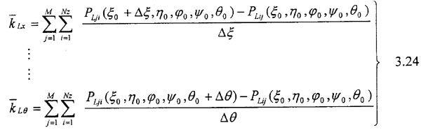已知在某一個(gè)條件下產(chǎn)生位移ξ00,00,假設(shè)使聯(lián)軸器產(chǎn)生的相對(duì)扭轉(zhuǎn)角位移θ0,根據(jù)式3.23計(jì)算T,計(jì)算的T與給定的工況即聯(lián)軸器傳遞的扭矩T相比較,當(dāng)差值達(dá)到精度要求時(shí),求出此時(shí)內(nèi)外齒的靜態(tài)力,反過(guò)來(lái)也就是在Pξ,Pη,P,Pψ,T的工況作用下聯(lián)軸器的靜態(tài)位置為(ξ00,000)。如果沒(méi)有達(dá)到精度則修改θ0值重復(fù)以上計(jì)算。得到靜平衡位置后再利用式3.24求得25個(gè)剛度系數(shù)。
