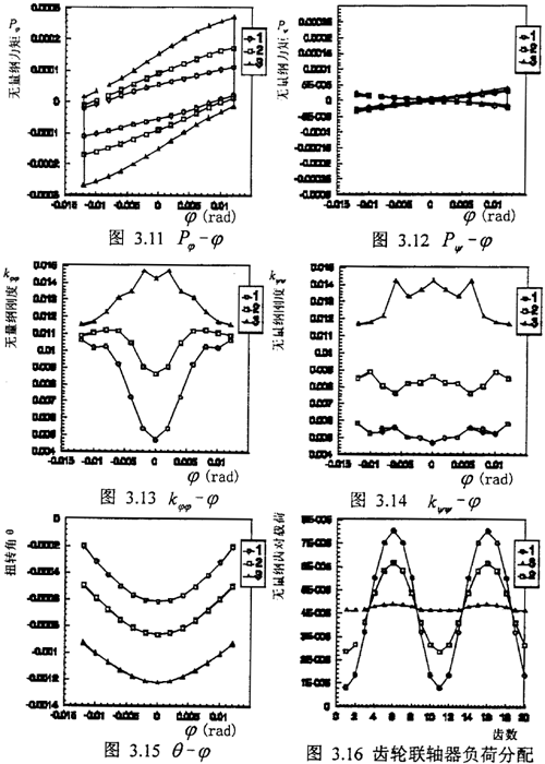 圖3.11,3.12是無量綱轉(zhuǎn)矩與轉(zhuǎn)角位稱P-,Pψ-曲線1,2,3代表三種工況。從圖中我們可以看出,由于磨擦力的影響,P,Pψ變化一個周期內(nèi),前半周期和后半周期并不是沿同一條曲線變化,而是一條封閉的遲滯曲線,這是齒面之間存在干磨擦的結(jié)果,同時在每半個周期內(nèi)P-,Pψ-的變化并不是直線,齒輪聯(lián)軸器附加力矩是位移的非線性函數(shù),同時說明聯(lián)軸器的剛度并不是一個定值,也是位移的函數(shù),從圖3.12中可以看出,ψ-方向存在一定的耦合關(guān)系。圖3.16是在工況T1,不同的值(1=1.2e-2rad,2=0.6e-2rad,3=0.0rad)時20個齒對力的分布情況,從圖中可以明顯看出當齒輪聯(lián)軸器的內(nèi)外齒輪的相對轉(zhuǎn)角增大,每個齒輪承受的載荷越不均勻,載荷集中到某些齒上,這與第二章中從最小間隙的角度推導的結(jié)果相同。圖3.15是在三種工況下相對扭轉(zhuǎn)解聯(lián)軸器θ隨的變化關(guān)系圖,從圖中我們可以明顯的看出θ與的存在一定的耦合關(guān)系,且隨著齒輪聯(lián)軸器的內(nèi)外齒輪的相對轉(zhuǎn)角增大其θ變化越快,即θ曲線斜率隨著相對轉(zhuǎn)角增加而增大,在=0處θ曲線斜率為零,即在齒輪聯(lián)軸器的內(nèi)外齒輪完全對中時作微小擾動時對θ影響很小。