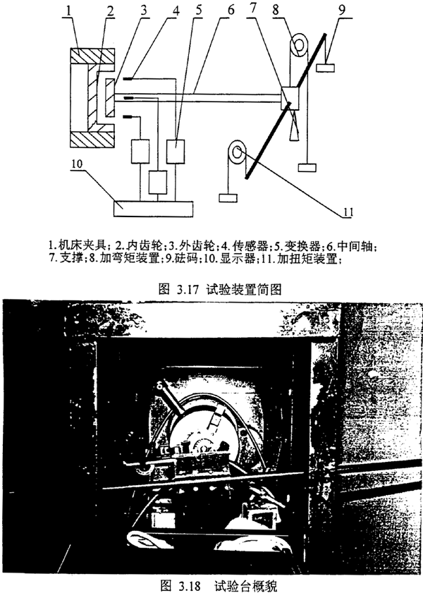 為了驗證理論解析結(jié)果,我們設(shè)計了如圖所示的試驗裝置,取兩個雙聯(lián)齒輪聯(lián)軸器(一個外齒輪為直齒,一個外齒輪為鼓形齒)。對其進行彎曲剛度的測試。齒輪聯(lián)軸器的內(nèi)齒圈,固定在車床的三爪卡盤上,雙聯(lián)齒輪外齒的一端插入內(nèi)齒圈與內(nèi)齒嚙合,而另一端支承在支點A上,在A端有兩套滑輪杠桿系統(tǒng)如圖3.17,一套是用來給齒輪聯(lián)軸器施加扭矩,另一套是用來給齒輪聯(lián)軸器施加X方向的彎矩。三個傳感器裝在如圖所示的位置,測量垂直和水平方向的位移。