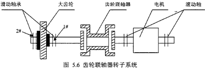 圖5.6是國產(chǎn)DH型透平壓縮機(jī)結(jié)構(gòu)簡圖1-2中,齒輪軸(簡稱G軸)、電機(jī)、齒輪聯(lián)軸器、軸承組成的轉(zhuǎn)子系統(tǒng)。這是我們主要研究對(duì)象。
