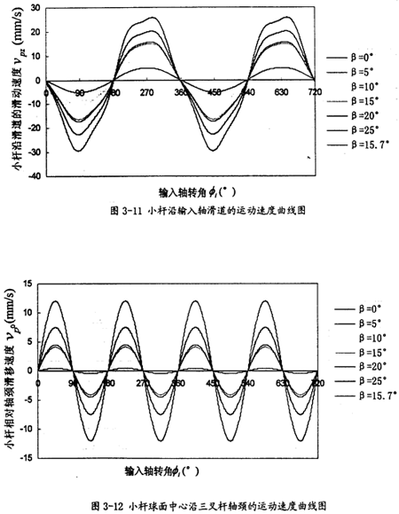 由曲線圖3-11可以看出,小桿沿滑道的運(yùn)動(dòng)速度也具有周期性,它的變化頻率為一個(gè)回轉(zhuǎn)周期1次。曲線同正弦線有一點(diǎn)相似,但上下不對(duì)稱,隨兩軸夾角β的增大其最大值增長(zhǎng)較快,這一數(shù)值可以作為動(dòng)力分析中摩擦計(jì)算的重要依據(jù)。