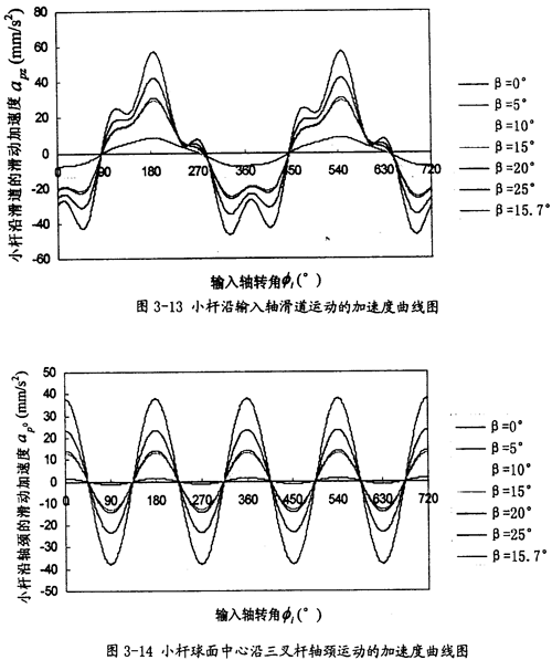 由曲線圖3-13可以看出,小桿沿滑道的運(yùn)動(dòng)加速度其變化較為復(fù)雜,變化具有周期性,變化頻率為一個(gè)回轉(zhuǎn)周期1次。隨兩軸夾角β的增大其最大值增長(zhǎng)較快,它的值可以作為動(dòng)力分析和設(shè)計(jì)計(jì)算的重要依據(jù)。