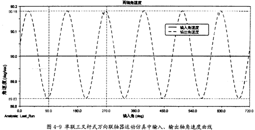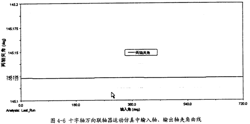 選取合適的步長,在缺省模式下(由前面的自上度為0,可知此時的仿真是運動仿真)對模型做仿真分析,并在結果中輸出兩軸夾角的測量值曲線圖(如圖4-6所示)以及輸入、輸出軸角速度測量的曲線圖(如圖4-7所示)。