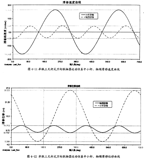 由圖4-12可以知道,在一定的夾角下,小桿在滑道中的滑移位移同小桿球面中心相對軸頸的滑移位移是不同的,前者(20.76mm)要遠(yuǎn)大于后者(2.93mm),且它們變動的頻率也不一樣,在一個回轉(zhuǎn)周期中,前者步率是1次,而后者2次。此圖中的兩曲線同第三章中的理論分析曲線圖3-9、圖3-10是吻合的。這在一定的程度上也證明了三叉桿式萬向聯(lián)軸器理論分析中對小桿滑移位移和軸頸滑移位移這兩項計算的正確性。