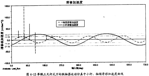 由圖4-13可以知道,在一定的夾角下,小桿在滑道中有滑移加速度同小桿球面中心相對軸頸的滑移加速度是不同的,前者要大于后者,且它們變動的頻率也不一樣,在一個回轉(zhuǎn)周期中,前頻率是1次,而后者2次。此圖中的兩曲線同第三章中的理論分析曲線圖3-13、圖3-14是吻合的,只是小桿滑移的加速度曲線在外形上有差異,仿真的曲線相當(dāng)?shù)钠交、?guī)則,但理論分析曲線卻不規(guī)則,這可能是在計算中簡化和省略的原因。盡管如下,這在一定的程度上也證明了三叉桿式萬向聯(lián)軸器理論分析中對小桿滑移加速度和軸頸滑移加速度這兩項計算的正確性。(值得說明的是此圖中曲線有時有突變的現(xiàn)象,主要是考慮到計算機(jī)的性能,計算中步長稍大的原故。在后面的分析曲線中也出現(xiàn)了這樣的情況,將不再作說明。)