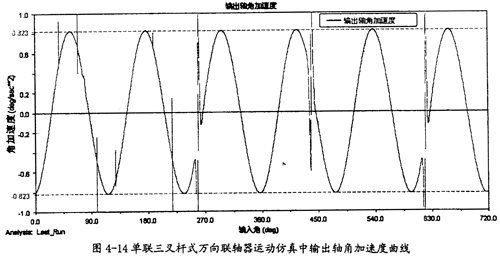 由圖4-9可以知道,當(dāng)輸入軸轉(zhuǎn)速恒定為90o/s時,輸出軸并不作恒速轉(zhuǎn)動,而是以90o/s為中心,作非常有規(guī)律的周期性運(yùn)動,在每一個回轉(zhuǎn)周期中,它的變化頻率為3次。這里的結(jié)果同第三章中的曲線圖3-8也是完全吻合的,因此在一定的程度上也證明了三叉桿萬向聯(lián)軸器轉(zhuǎn)速分析理論的正確性。
