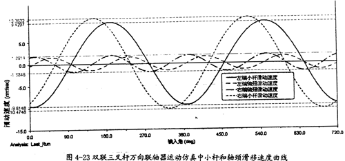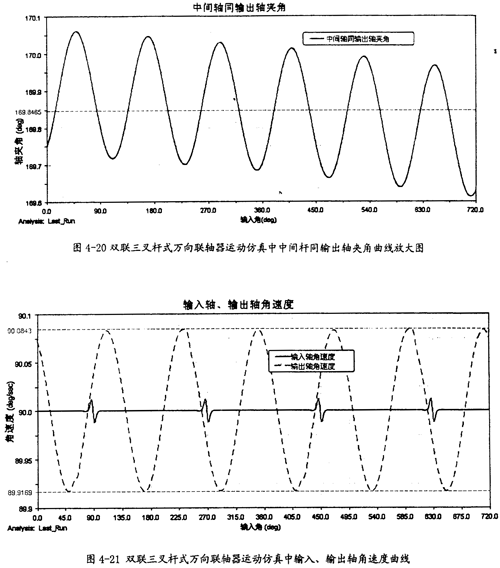 由圖4-21可以看出,雙聯(lián)三叉桿式萬(wàn)向聯(lián)軸器同單聯(lián)三叉桿式萬(wàn)向聯(lián)軸器的輸出曲線相似,當(dāng)輸入軸轉(zhuǎn)速恒定時(shí),輸出軸轉(zhuǎn)速呈現(xiàn)有規(guī)律的波動(dòng),在每一個(gè)回轉(zhuǎn)周期中,它的變化頻率為3次,同圖3-8中的β=10°時(shí)的曲線相比,雙聯(lián)同單聯(lián)的情況差不多,故三叉桿式萬(wàn)向聯(lián)軸器在雙聯(lián)的結(jié)構(gòu)形式下輸出轉(zhuǎn)速特性直觀上無(wú)改善。