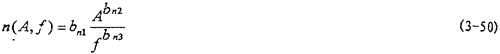 即恢復力(A,f,x,)是振幅A、激勵頻率f、瞬態(tài)位移x和瞬態(tài)速度的函數(shù),或者說恢復力Q是剛度函數(shù)K1(A),K3(A),K5(A)和阻尼函數(shù)C(A,f)以及阻尼成分函數(shù)n(A,f)的函數(shù),其中阻尼成分函數(shù)n(A,f)描述阻尼的組成情況,n(A,f)=0時,阻尼為干摩擦阻尼,n(A,f)=1時,為粘性阻尼,0<n(A,f)<1時,阻尼由粘性阻尼和干摩擦阻尼組成,n(A,f)>1時,阻尼成為“高階”阻尼。對于(3-47)式,當振幅與頻率一定時,式中的Kl(A),K3(A),K5(A)和n(A,f)均為定數(shù),當振幅A和頻率變化時,它們均是函數(shù),因此參數(shù)辨識實質(zhì)上是參數(shù)函數(shù)的辨識。首先我們用非線性參數(shù)辨識方法Marquardt法,根據(jù)試驗所得的數(shù)據(jù),按照(3-47)式對每一遲滯回線進行參數(shù)辨識,可以得到對應的K1(A),K3(A),K5(A),C(A,f)和n(A,f)值,對每種工況下的數(shù)據(jù)隨振幅和頻率變化趨勢進行分析后,可以建立剛度函數(shù)、阻尼函數(shù)和阻尼成份函數(shù)的數(shù)學表達式為:
