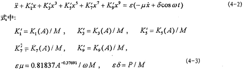 式中M為系統(tǒng)質(zhì)量,P為激勵力幅值,ω為激勵園頻率(x,,A,ω)=1(A,x)+2(A,ω,),12分別為上章中的(3-12)和(3-41)式。為研究方便,將(3-12)和(3-41)式代入(4-1)式并改寫成以下形式: