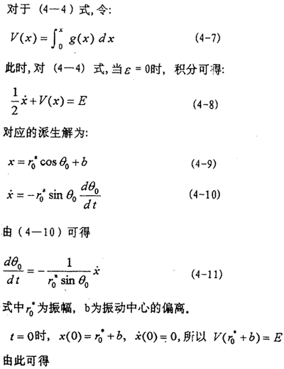 目前文獻上的一些方法對于弱非線性系統(tǒng)是有效的,而對于(4-2)式的強非線性系統(tǒng)則遇到了麻煩。由于描述非線性振動系統(tǒng)的微分方程種類繁多,沒有普遍的解法,因此,仍然只有極少非線性振動方程可求得精確解?尚械霓k法是針對不同非線性振動方程的特點尋求一些近似數(shù)值解法。為研究方便,將(4-2)式進一步寫成以下形式: