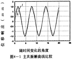 曲線圖如圖4-1所示。從圖中可以看到解析解曲線1和數(shù)字仿真解曲線2重合性較好,在振幅與相位上誤差都較小。