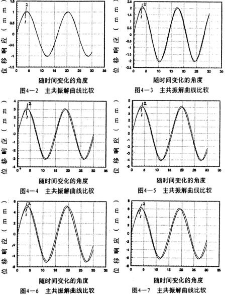 從各曲線圖可以看到(1).解析解曲線1與數(shù)字仿真解曲線2的振幅誤差較小,=1和=2時兩者的重合性很好。(2).隨著振幅的增大,解析解曲線1和仿真解曲線2在相位上產(chǎn)生微小變化,解析解的相位超前仿真一個小量,原因是隨著振幅的增大,系統(tǒng)呈現(xiàn)更為強烈的非線性,而在推導中略去了高次項,但還是可以滿足工程的要求。(3)從(4-78)-(4-85)式中的各δ值可知,在聯(lián)軸器產(chǎn)生主共振的情況下,激振力很小。