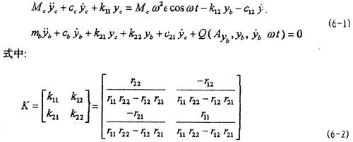 yc為圓盤在y軸方向的位移,c=dyc/dt,c=d2yc/dt2,分別為圓盤在y軸方向的速度和加速度,yb,b=dyb/dt,b= d2yb/dt2,分別為聯(lián)軸器從動端質(zhì)量塊mb在y軸方向的位移、速度和加速度。k11,k 12,k 21,k 22為轉(zhuǎn)軸的剛度系數(shù),cc,cb,c12,c21為轉(zhuǎn)軸的阻尼系數(shù),Q為聯(lián)軸器恢復(fù)力。Mc=mc+ms,ms為轉(zhuǎn)軸及軸套的質(zhì)量,mc為圓盤的質(zhì)量,ω為轉(zhuǎn)軸的角速度。