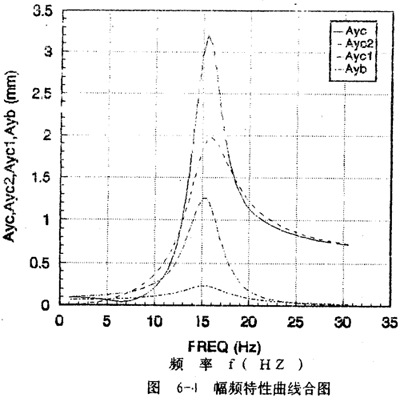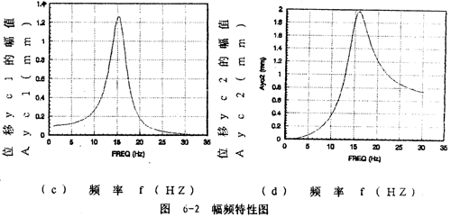 yc2的幅頻特性如圖6-2(d)所示。Ayc2從1赫茲開始隨頻率的增大而迅速增大,在軸系的二階固有頻率15.56赫茲處達到最大值,然后隨頻率增大而減小并趨于某一定值,Ayc2隨頻率變化的規(guī)律反映圓盤僅在質(zhì)量偏心激勵下,而軸系沒有鋼絲繩聯(lián)軸器影響時圓盤的幅頻特性。考慮上聯(lián)軸器對圓盤幅頻特性的影響部分Ayc1(圖6-2(c)所示部分),則圓盤的幅頻特性即為圖6-2(a)所示。由此可見,鋼絲繩聯(lián)軸器在頻率的較低段(0~11赫茲)對圓盤振動有抑制作用。值得一提的是Ayc不是Ayc1和Ayc2的簡單相加,而與各頻率對應(yīng)的向量{a}中17個元素以及相位有關(guān)。