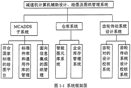 減速機(jī)計算機(jī)輔助設(shè)計、繪圖及圖紙管理系統(tǒng)主要包括MCADDS子系統(tǒng)和齒輪傳動系統(tǒng)的設(shè)計系統(tǒng)和信息管理系統(tǒng)三部分(見圖1-1),其中MCADDS子系統(tǒng)實現(xiàn)高效繪圖;齒輪傳動系統(tǒng)的設(shè)計系統(tǒng)快速精確的實現(xiàn)產(chǎn)品設(shè)計;而信息管理系統(tǒng)將提高企業(yè)的信息管理與控制,提高資源利用率。