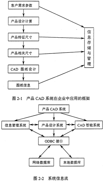 從企業(yè)的角度來說,利用計(jì)算機(jī)技術(shù),將企業(yè)的產(chǎn)品設(shè)計(jì)流程與企業(yè)管理有效地結(jié)合起來(圖2-l),實(shí)現(xiàn)企業(yè)管理與產(chǎn)品設(shè)計(jì)一體化。從系統(tǒng)實(shí)現(xiàn)的角度來說,是將CAD系統(tǒng)、信息管理系統(tǒng)和工程數(shù)據(jù)庫在網(wǎng)絡(luò)上的結(jié)合,見圖2-2,產(chǎn)品CAD系統(tǒng)包括產(chǎn)品信息管理系統(tǒng)和CAD的二次開發(fā)系統(tǒng),特點(diǎn)突出: