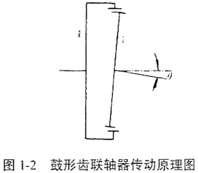 鼓形齒聯(lián)軸器傳動(dòng)原理如圖1-2所示。鼓形齒聯(lián)軸器的內(nèi)齒輪為一直齒內(nèi)齒輪,外齒輪是齒頂面為一球面的鼓形齒輪。根據(jù)外齒輪齒面形成方式的不同,外齒輪又分為共軛齒面鼓形齒輪和非共軛齒面鼓形齒輪。由于鼓形齒輪加工工藝的關(guān)系,現(xiàn)使用的鼓形齒聯(lián)軸器多為非共軛齒面外齒輪的鼓形齒聯(lián)軸器。共軛齒面的鼓形齒齒面由與內(nèi)齒輪共軛的加工方式產(chǎn)生;非共軛齒面的鼓形齒齒面相當(dāng)于在不同端截面逐漸變位的一系列齒輪片機(jī)疊而成,變位量與軸向坐標(biāo)形成的曲線稱(chēng)為鼓度曲線。鼓度曲線是鼓形齒聯(lián)軸器特有的重要幾何參數(shù),現(xiàn)所用的多為一段圓弧,也有用三段圓弧的,這些圓稱(chēng)為位移圓。在圓弧鼓度曲線中,有位移中心在齒輪軸線上的,有不在軸線上的;有位移圓中心與齒頂球面中心重合的,也有不同中心的,鼓度曲線的設(shè)計(jì)無(wú)統(tǒng)一理論方法,通常是以經(jīng)驗(yàn)設(shè)計(jì)。究竟采用哪種曲線,有不同的考慮方面,總的選定要求是:(1)在軸間傾角處于最大時(shí)不出現(xiàn)棱邊接觸現(xiàn)象;(2)輪齒集中載荷越小越好,而齒面曲率與位移圓曲率成正比,因此位移圓半徑應(yīng)盡可能大。鼓度曲線曲率半徑與內(nèi)齒單側(cè)減薄量成正比關(guān)系,即它與齒的嚙合間隙有關(guān),減薄量不足可能會(huì)造成干涉,減薄量過(guò)大則會(huì)削弱齒的強(qiáng)度且側(cè)隙太大。