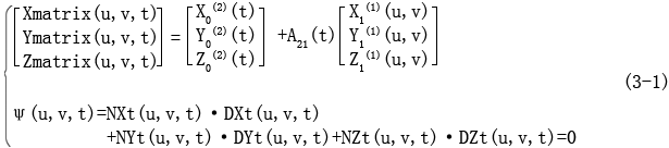 式(3-1)中第一式表示曲面Σ1由坐標系S1變換到坐標系S2所形成的曲面族,Xmatrix,Ymatrix,Zmatrix分別表示曲面族中各點在x,y,z坐標方向上的坐標值;第二式中的,NXt,NYt,NZt表示曲面Σ1在點(u,v)對應(yīng)于t的相對法矢分量,DXt,DYt,DZt表示點(u,v)運動軌跡對應(yīng)于t的相對切矢分量。
