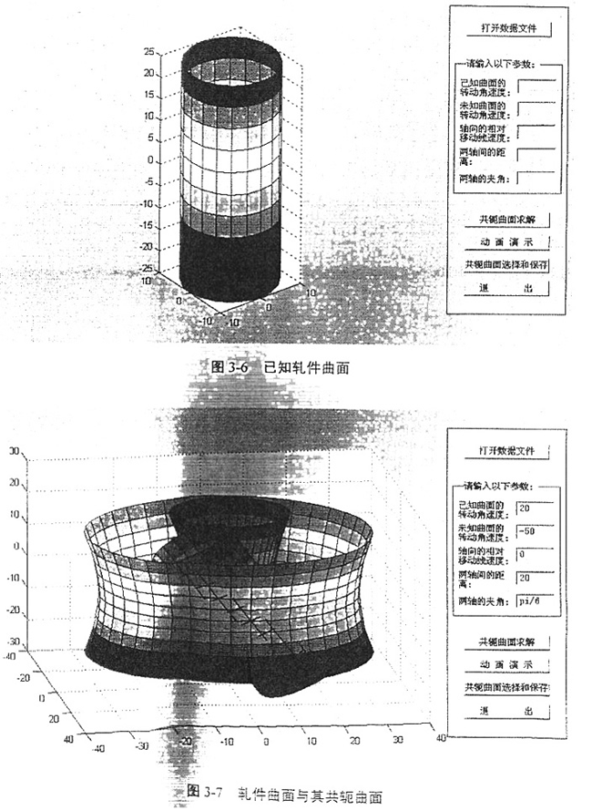求出共軛曲面各節(jié)點(diǎn)坐標(biāo)值后,調(diào)用MATLAB繪圖命令就可以顯示共軛曲面的圖形,并通過(guò)編制的程序,還能夠以動(dòng)畫(huà)的形式演示兩曲面作共軛運(yùn)動(dòng)的過(guò)程。求得的共軛曲面及兩曲面作共軛運(yùn)動(dòng)的瞬間分別如圖3-3、圖3-4所示: