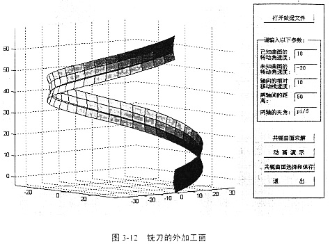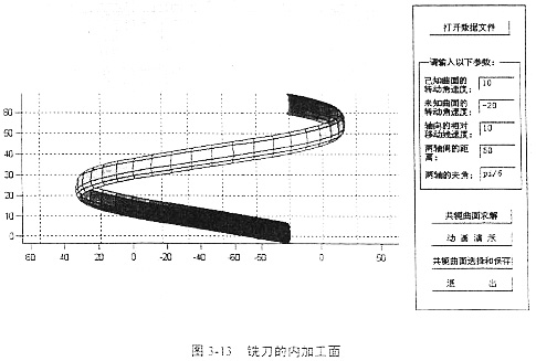 借助于軟件Conjugater1.0求銑刀加工的過(guò)程與求解軋輥曲面的過(guò)程相同。輸入輸出界面和結(jié)果如圖3-10、圖3-11、圖3-12、圖3-13所示。最后得到如圖的兩個(gè)螺旋面,這兩個(gè)螺旋面都是滿足共軛條件的,圖3-12表示銑刀在工件實(shí)體的外圓加工所得的曲面,圖3-13表示銑刀在工件的內(nèi)壁加工所得的曲面。應(yīng)用時(shí)可根據(jù)實(shí)際情況選取。