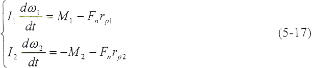 如果在t=0的瞬時,由于干擾載荷的作用,輪齒的變形量增大△δ,則齒上的載荷也獎增加△Fn,當(dāng)轉(zhuǎn)矩M1、M2為定值時,由齒輪的平衡條件可知,齒輪的角速度ω將發(fā)生周期性變化,而載荷和變形也以同一頻率變化。由(5-17)式和(5-18)式,得