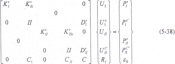 若用三角分解算法進行分解消元運算,使與接觸面有關的剛度矩陣變換成為單位矩陣,同時求出相應的系數(shù)矩陣的改變DⅠ、DⅡ和載荷向量的改變PⅠ′、PⅠC、PⅡ′、PⅡC,則矩陣方程成為