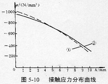基于上述接觸問題的有限元與邊界元計算模型和前面的載荷分析,對一模數(shù)m=5mm、齒數(shù)Z=40、分度圓壓力角a=20°、分度圓直徑d=200mm、齒寬b=20mm、齒輪材料的彈性常數(shù)E=2.1×105N/mm2、泊松比μ=0.3、傳遞扭矩Mn=300N·m的共軛鼓形齒聯(lián)軸器鼓形齒輪Ⅰ進行了接觸應力計算,其簡圖如圖5-9所示。該問題接觸應力的有限元與邊界元數(shù)值解和接觸應力分布曲線分別如表5-1、圖5-10所示。曲線①(虛線)為接觸應力的有限元解;曲線②(實線)為接觸應力的邊界元解。