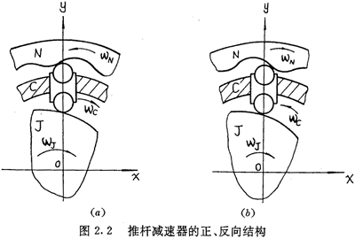 在推桿減速器中,設激波器按順時針方向旋轉,則傳動圈C,內齒圈N的轉向可能與激波器相同,也可能相反(圖2.2)。為了研究問題的方便,本文中稱傳動圈與主動件激波器轉向相同的結構為正向結構(圖2.2(a)),稱傳動圈與激波器轉向相反的結構為反向結構(圖2.2(b))。