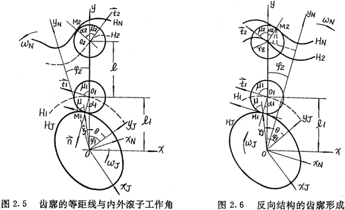 外滾子中心O2的軌跡H2是內齒圈齒廓的內法向等距線,它可以看作是一條以φ2為參數(shù)按順時針方向形成的有向曲線(對圖2.6所示反向結構,H2是一條按逆時針方向形成的有向曲線H2的方程為: