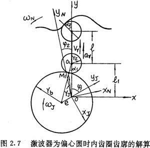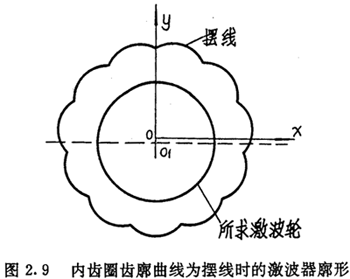 由上面可以看出,在選定激波器廓形TJ=TJ(θ)的情況下,正反兩種結(jié)構(gòu)所得到的內(nèi)齒圈齒廓方程式(2.21)與式(2.22)在形式上是不同的。對(duì)于反向結(jié)構(gòu),用-θ代換激波器方程中的θ,即令TJ=TJ(-θ),則θ增加的方向?yàn)轫槙r(shí)針方向,若激波器廓形可表示為偶函數(shù),即TJ(—θ)=TJ(θ),讓激波器按逆時(shí)針方向轉(zhuǎn)動(dòng),則所得的內(nèi)齒圈齒廓方程式完全與(2.21)式相同。因而齒廓方程式(2.22)與式(2.21)雖然形式不同,但實(shí)質(zhì)是一樣的。區(qū)別在于參數(shù)吸的取值方向,今后以式(2.21)作為內(nèi)齒圈齒廓的標(biāo)準(zhǔn)形式。