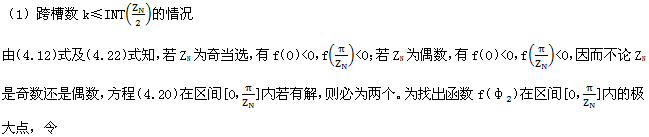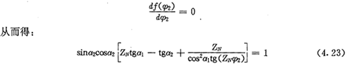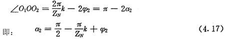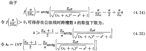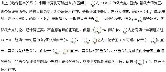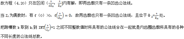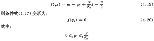 上式就是齒廓AB上與跨槽數(shù)為k的齒廓具有公法線的點的條件。當k確定后,若存在公法線,則由(4.17)式并結合基本關系式(2.38)等可解出φ2的值來。